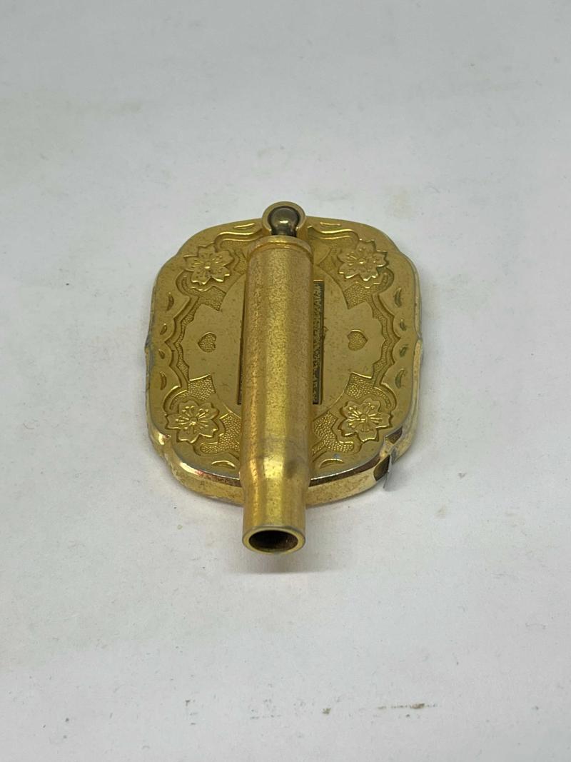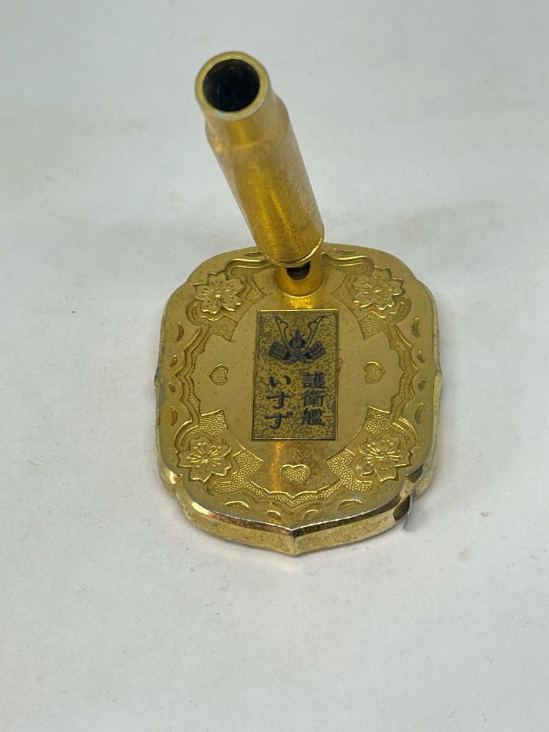A commemorative desk paperweight, pen holder and tape measure, probably an officers desk ornament.