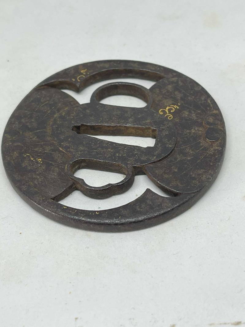 Edo or Earlier Samurai Iron carved Tsuba, Signed - ECHIZEN JYUKINUCHI, with gold inlay, nice collectors item .