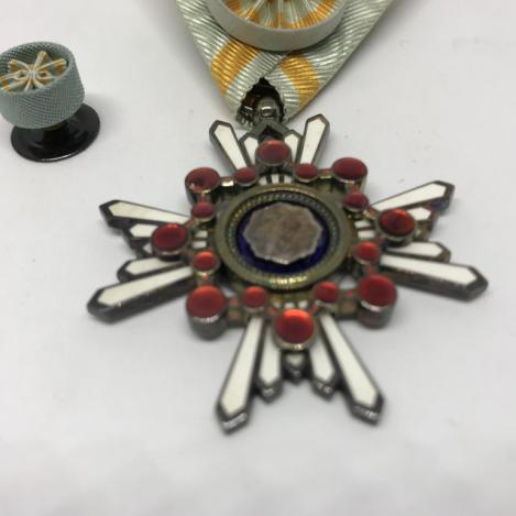 Imperial Japan Medal Order of the Sacred Treasure 4th Class. Established in 1888. This is an early issue as it has the rivets on reverse side pre WW2, with button pin. In excellent condition.