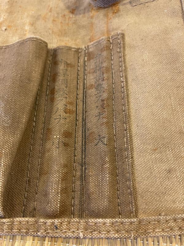 Imperial Japanese Army canvas tool roll / sack, most likely Aviation or Tank mechanics roll, lots of kanji and labeled areas.